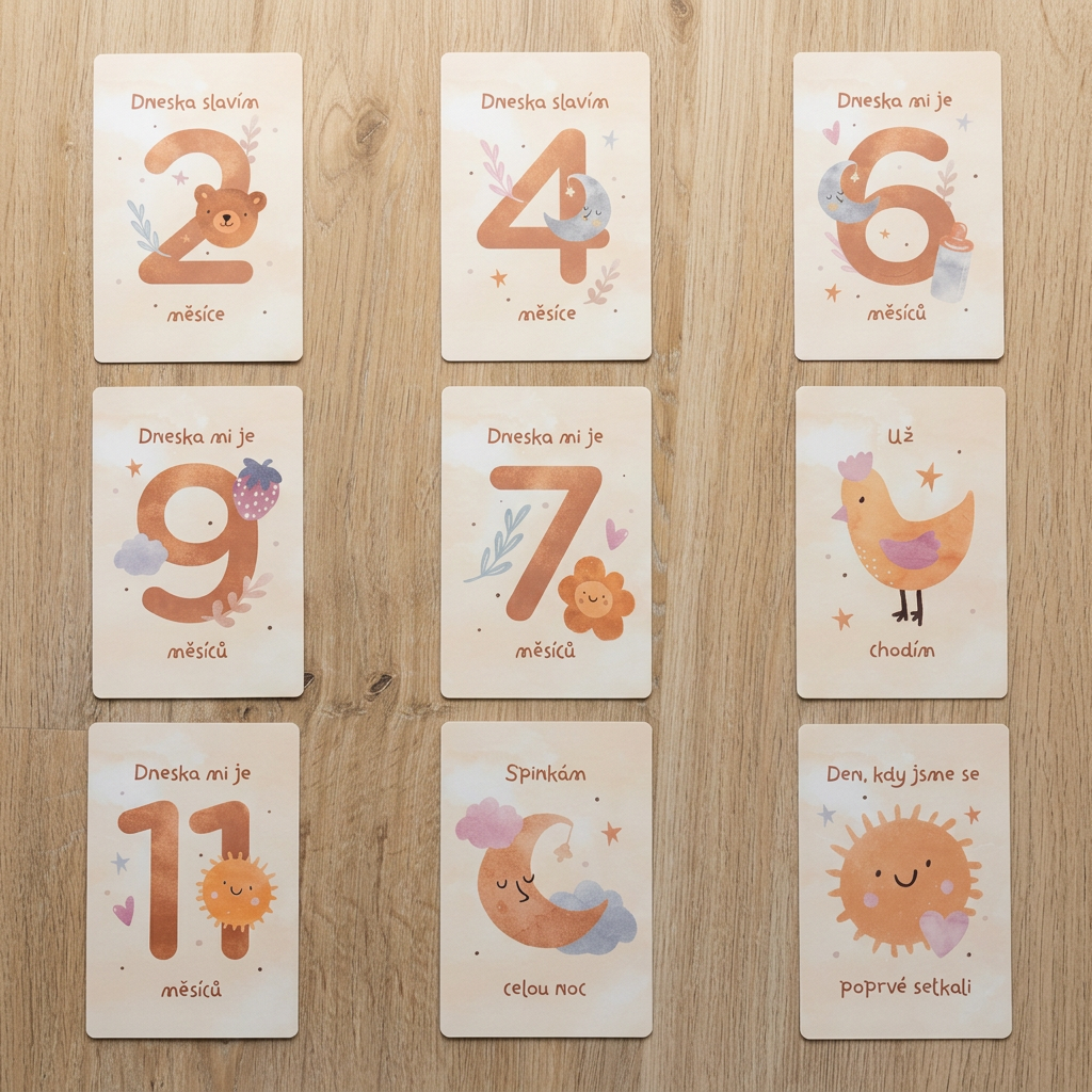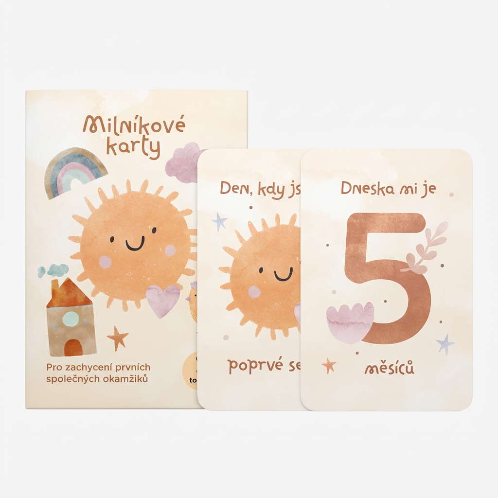 Milníkové kartičky vám pomohou zachytit všechna důležitá „poprvé“. Od prvního setkání a prvního úsměvu, přes první společné měsíce až po první krůčky a první (konečně) prospinkanou noc.